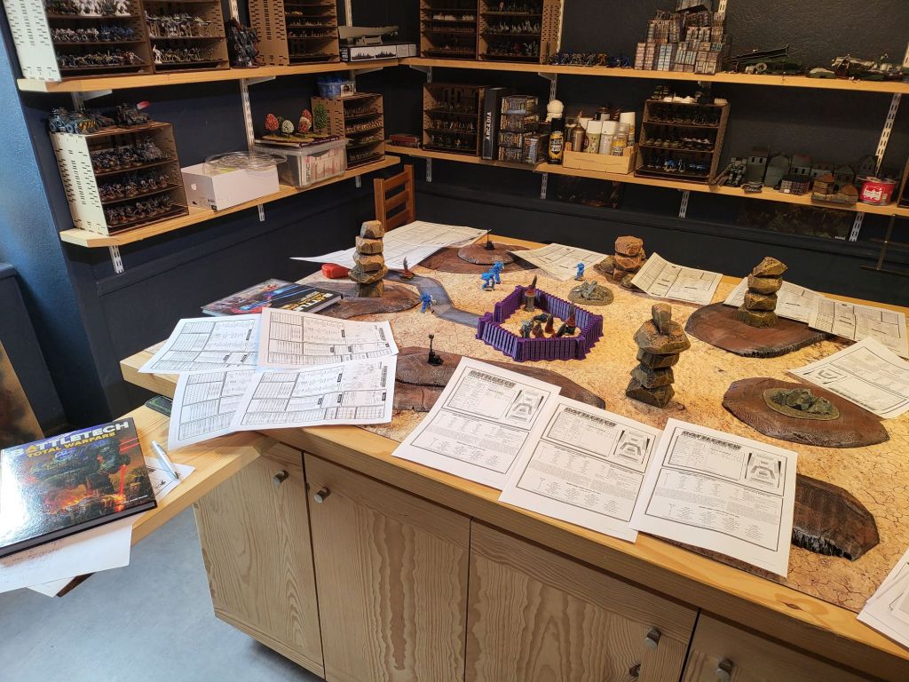 Une petite vue de la quantité de papier nécessaire pour jouer, des outils électroniques sont dispo (page web, applis) mais je préfère le papier 🙂