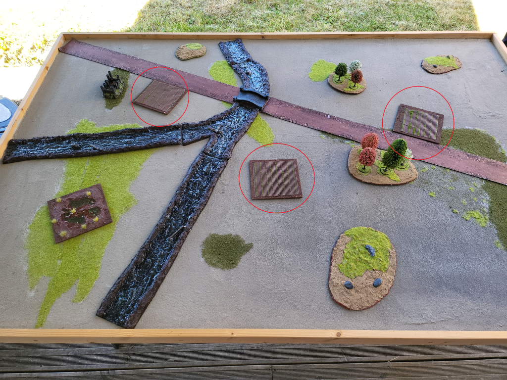 Mon adversaire doit sortir au moins 3 squads et/ou véhicules par le Nord (à gauche du plateau), il n’a pas de panzerfaust mais un bonus aux grenades fumigènes.