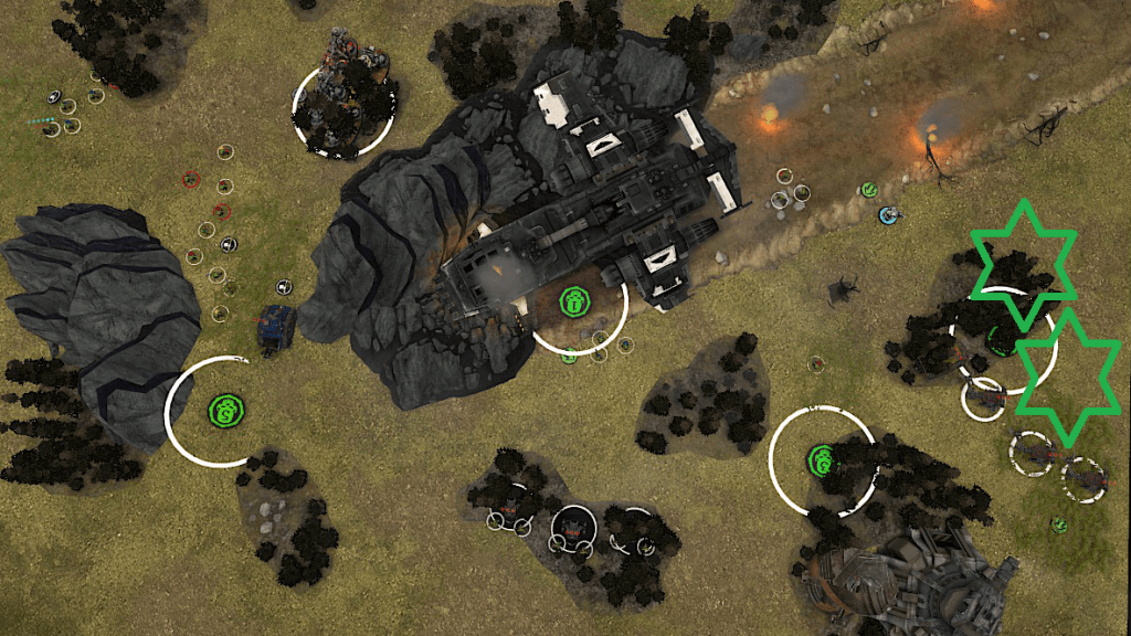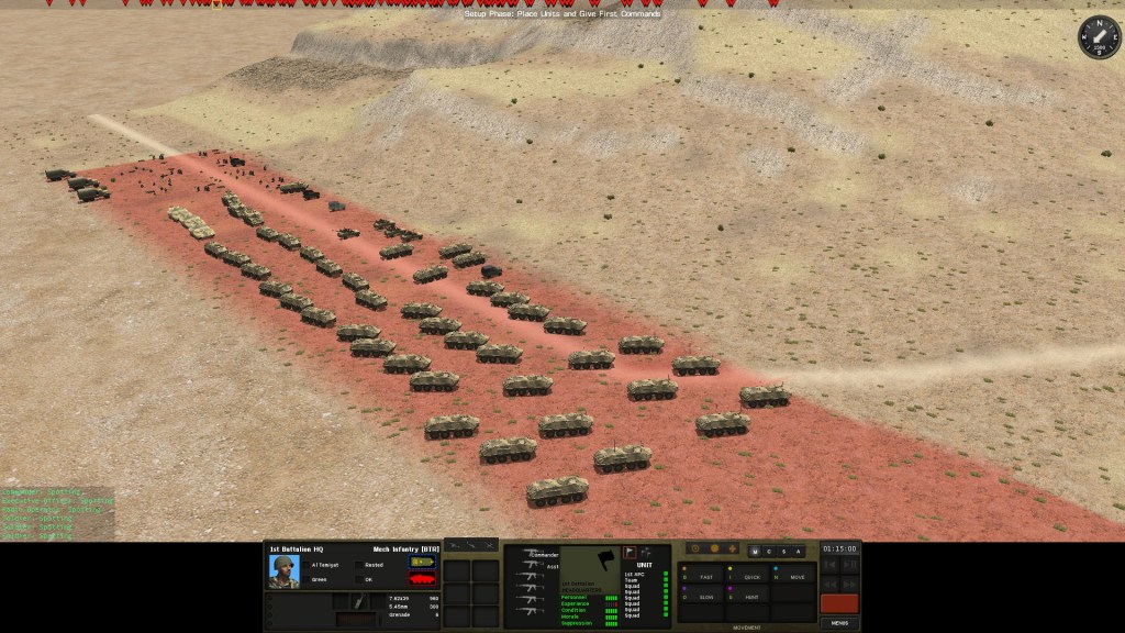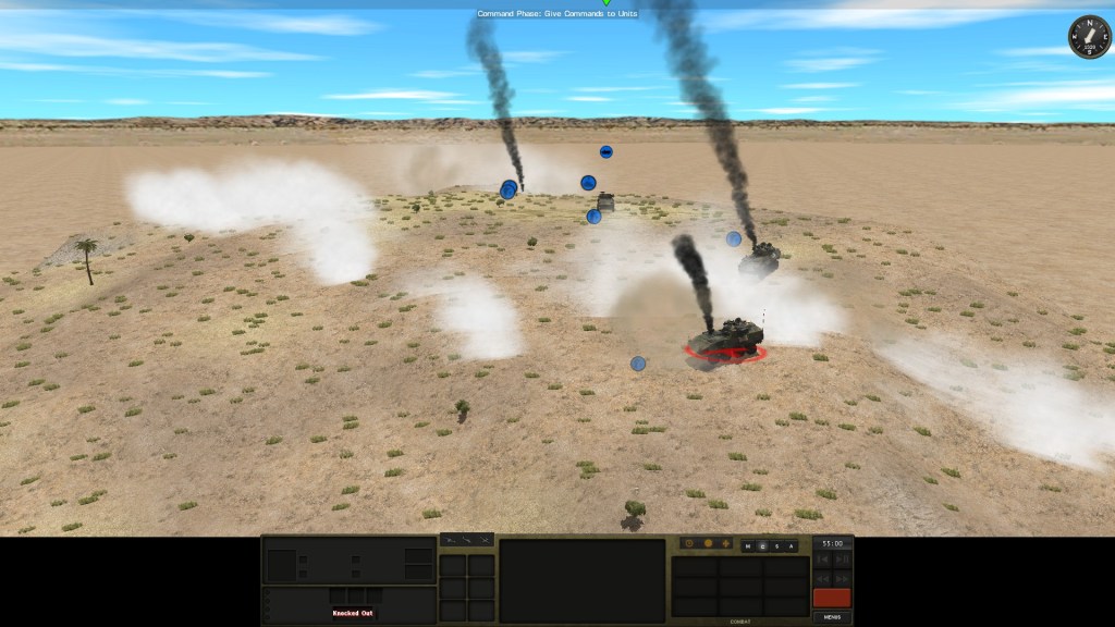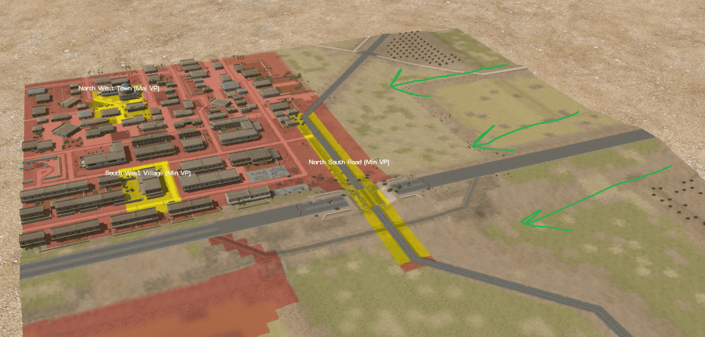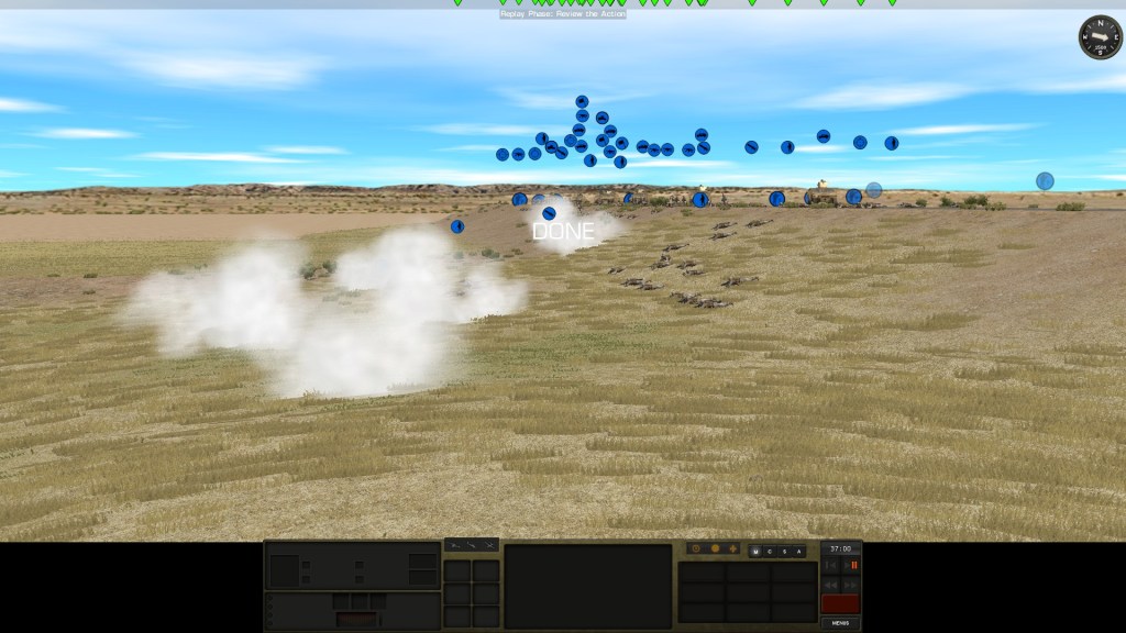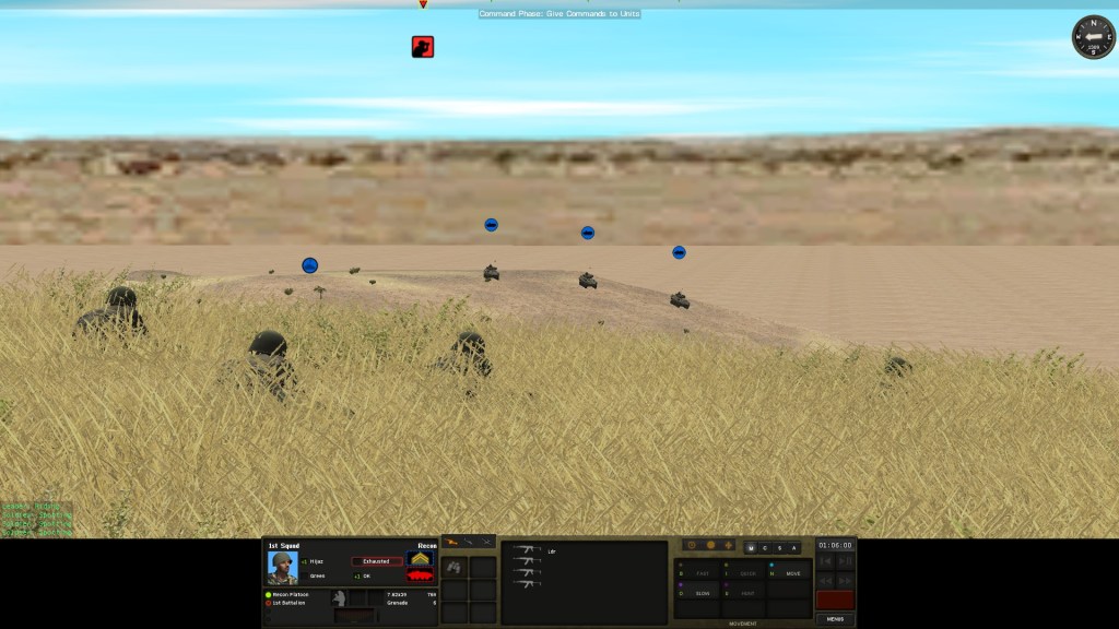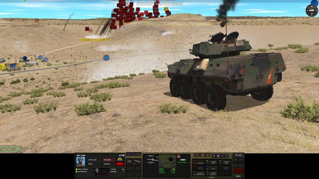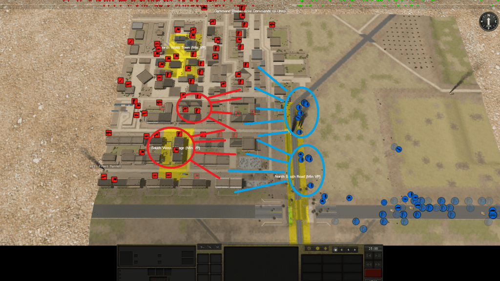 Je pense commencer à saisir son plan, une base de feu s’est positionnée sur la route surélevée pendant que des éléments de manœuvrent tournent ce qui semble être mon dispositif défensif. Mais mes forces au nord sont intactes et toujours cachées, en embuscade. Croit il que ce flanc est non défendu ?