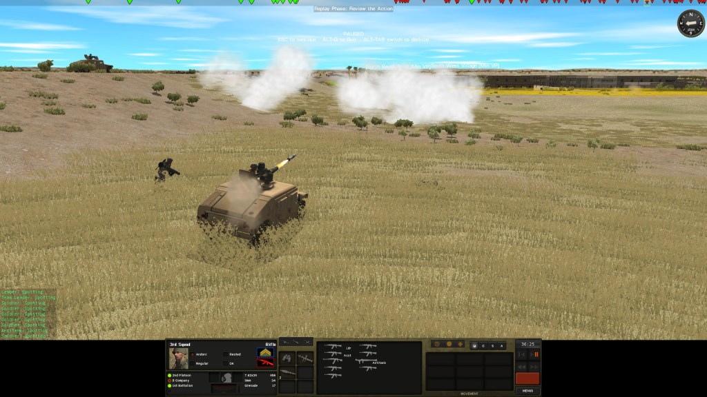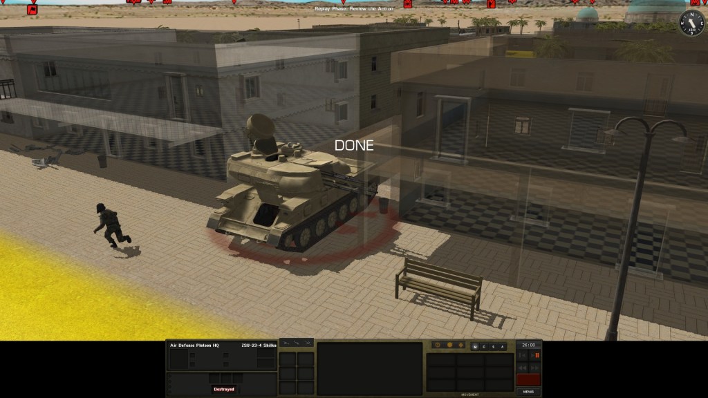 Mon adversaire s’adapte, et les grenades fumigènes commencent en envelopper ses troupes, le Shilka n’a pas de nouvelles opportunités de tir.
