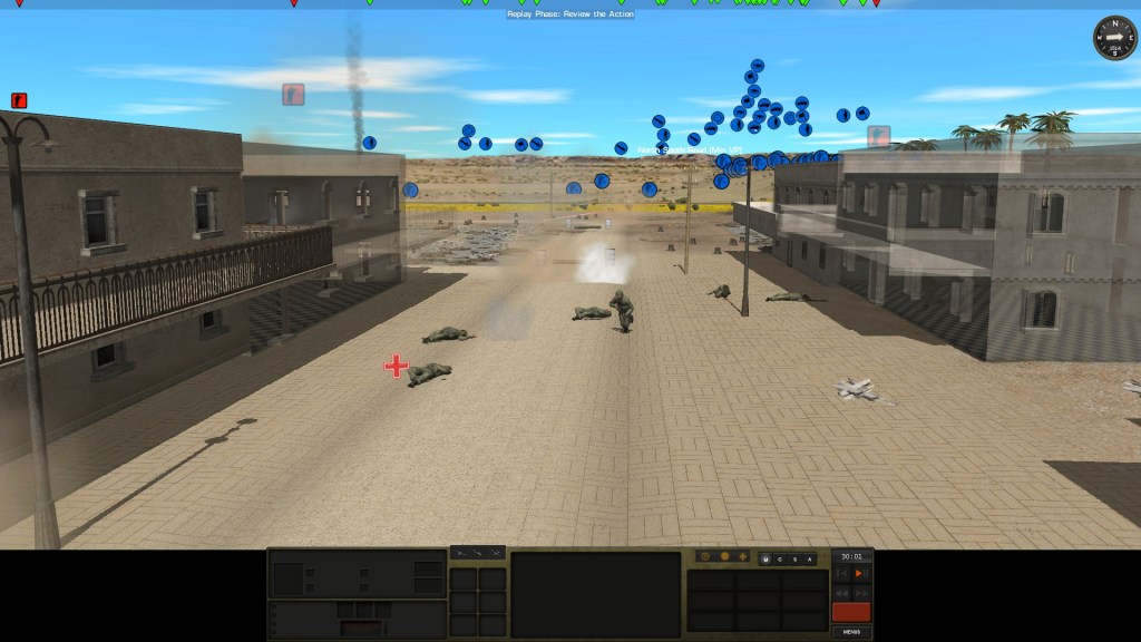 La bâtiments sur le flanc droit devenant des pièges mortels, j’installe quelques hommes dans la rue, sous les balcons, hélas les lances grenades automatiques de l’ennemi font un carnage.