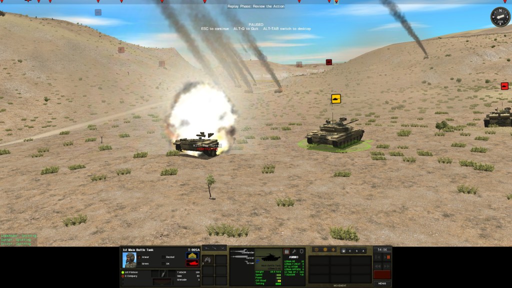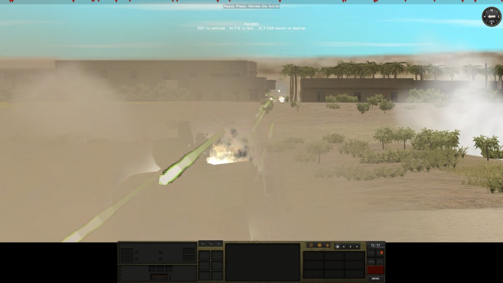 Au centre, son Sdkfz armé tente de tirer sur le flanc de mon T26 pour ouvrir le passage à ses troupes de l’Est, il touche mais l’obus n’explose pas, un squad arrive en combat rapproché avec l’autre T26 mais échoue à le détruire.
