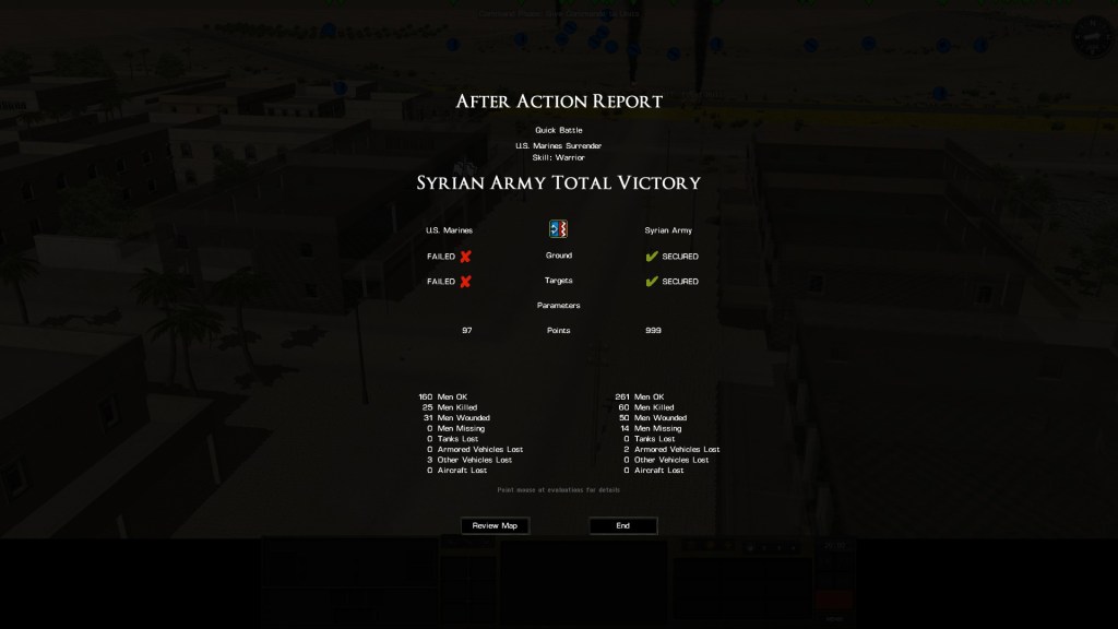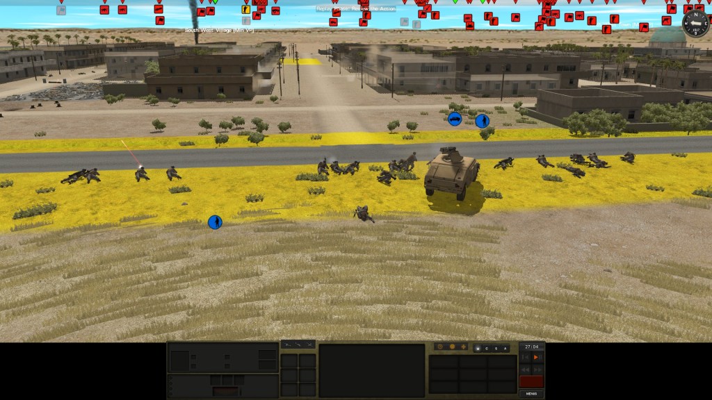 H+5Minutes, ils arrivent en masse. Les Humvee avec lances grenades automatiques arrosent les bâtiments en lisière de la ville (mon plan fonctionne, ces bâtiments sont vides), mais également mes quelques positions qui se dévoilent sous la pression. Un ATGM et deux mitrailleuses sont perdues.