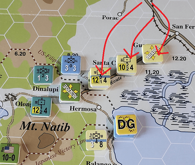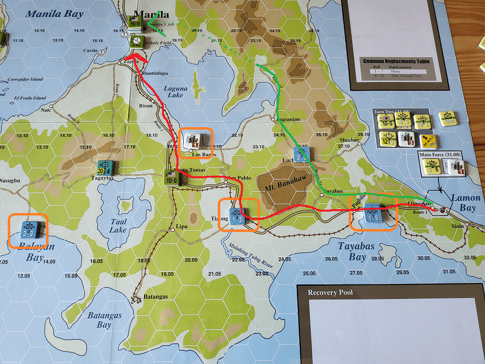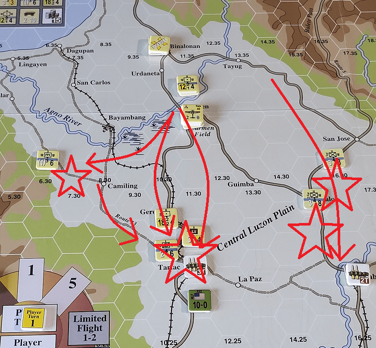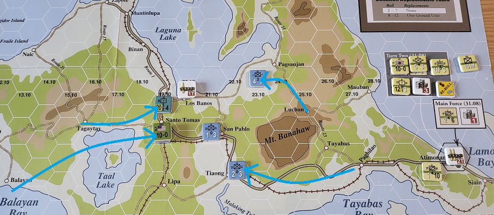Au sud, la force japonaise dispose de deux route, celle de l’Est est peu praticable, dans des collines accidentées. La plus évidente, au centre n’est défendue que par de faibles forces (qualité de 1 ou de 0, le chiffre noir au centre), et un juteux dépôt de ravitaillement se trouve à Los Banos, de quoi approvisionner les envahisseurs s’ils s’en emparent avant que les américano-philippins ne le fassent sauter.