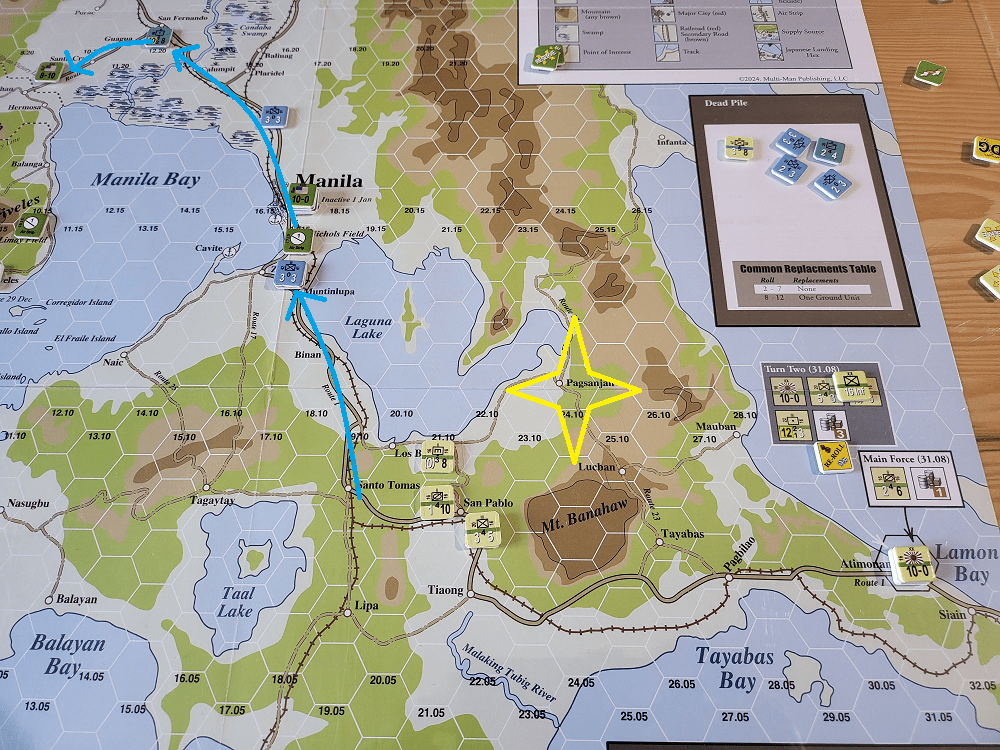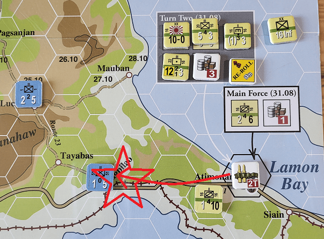 Les Alliés se replient vers Manille, pour monter une dernière défense au Sud de la ville (Note Histo : Mac Arthur a déclaré la cité « ville ouverte » pour lui épargner pertes civiles et destructions, se battre en ville impose un fort malus aux alliés, mais pas au japonais.), étant donné que pour une victoire par mort subite les japonais doivent prendre la ville au tour 3, ils n’ont qu’un tour à tenir avant de pouvoir se replier sans crainte.