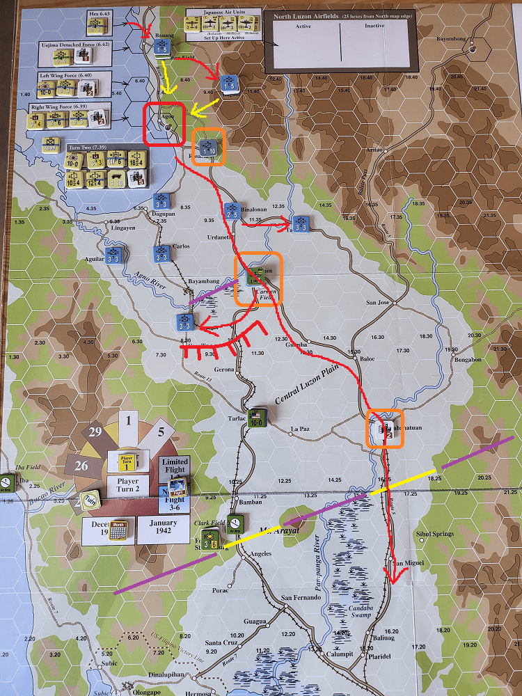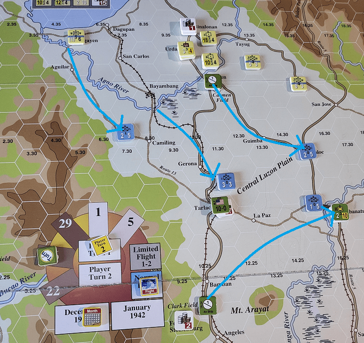 La compagnie de reco arrive à saisir un stock de ravitaillement allié dans les collines à l’Ouest de la plaine, pendant que les autres unités s’amassent. Un raid aérien parvient à désorganiser une pile d’unités alliées, si le japonais joue en premier au dernier tour, les alliés n’aurons pas l’occasion de les réorganiser.