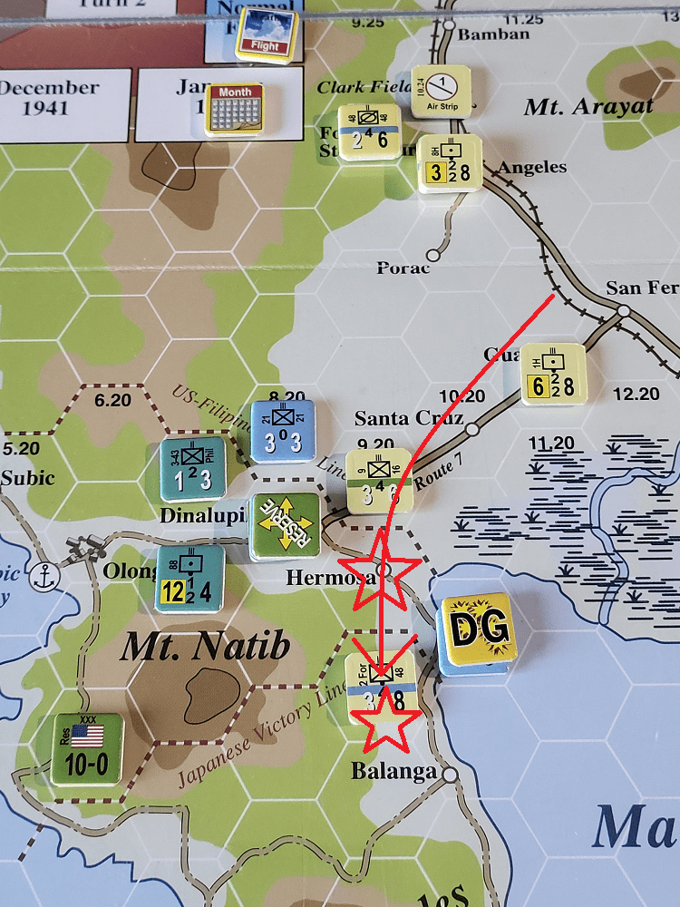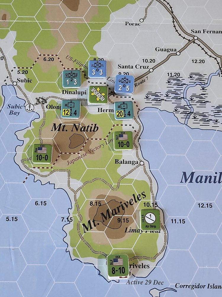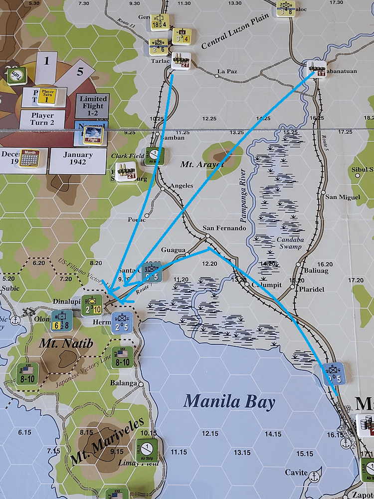 Le Japonais a un problème, il doit franchir la ligne indiquée sur la péninsule de Bataan, et occuper Manille avec suffisamment d’unités de combat pour établir une garnison. Or, les troupes du sud ne sont pas assez nombreuses. la 16eme division au Nord va donc devoir divertir une partie de ses forces vers Manille, et pas vers Bataan…