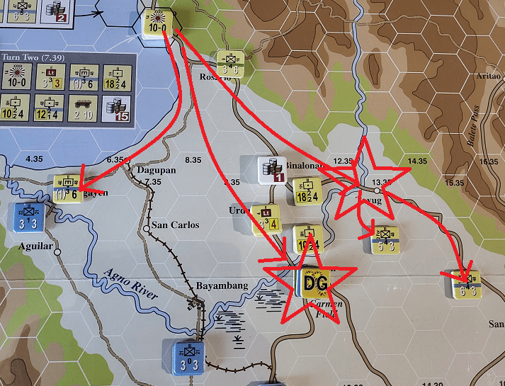 Au nord c’est plus complexe. La tête de pont est menacée par deux forces philippines au nord est des plages, qu’il conviendra d’éliminer afin de sécuriser la route de ravitaillement. Une unité de cavalerie US (qualité 4!)se trouve également sur la route.