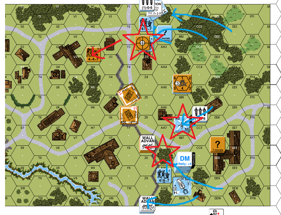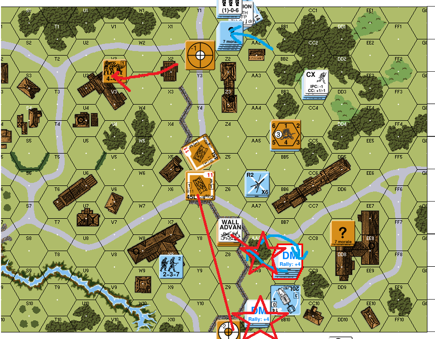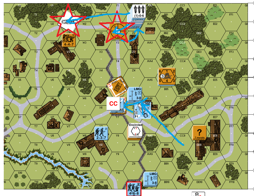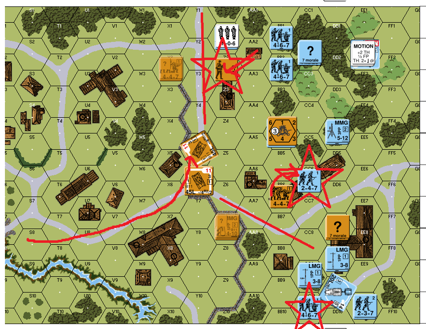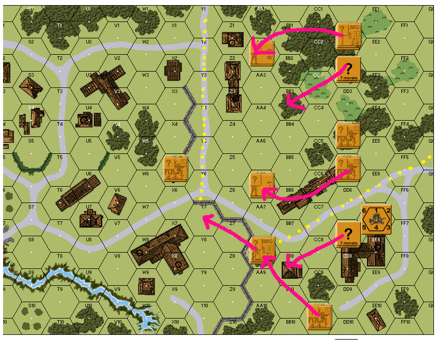 à L’ouest, ma mitrailleuse repousse un assaut, mais un demi squad la contourne, et pourra lui tirer dessus sans obstacle au tour suivant.