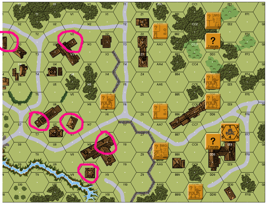 Je me positionne de façon à pouvoir tenir sous le feu la plupart des hexs d’entrée au Sud. Un squad reste en réserve au centre, prêt à se porter là où le plus gros de l’effort allemande se portera.